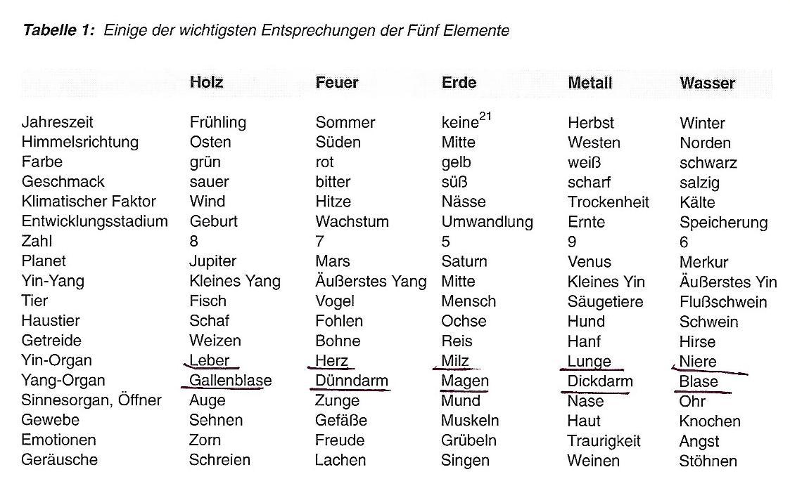Aus den 5 Wandlungsphasen entwickelte sich die 5 Elemente-Lehre. Jedem Element ist eine Jahreszeit, ein klimatischer Faktor, ein Geschmack, eine Emotion u.s.w. und letzlich auch ein Organ mit zugehörigem Öffner, dem entsprechenden Sinnesorgan, zugeordnet.